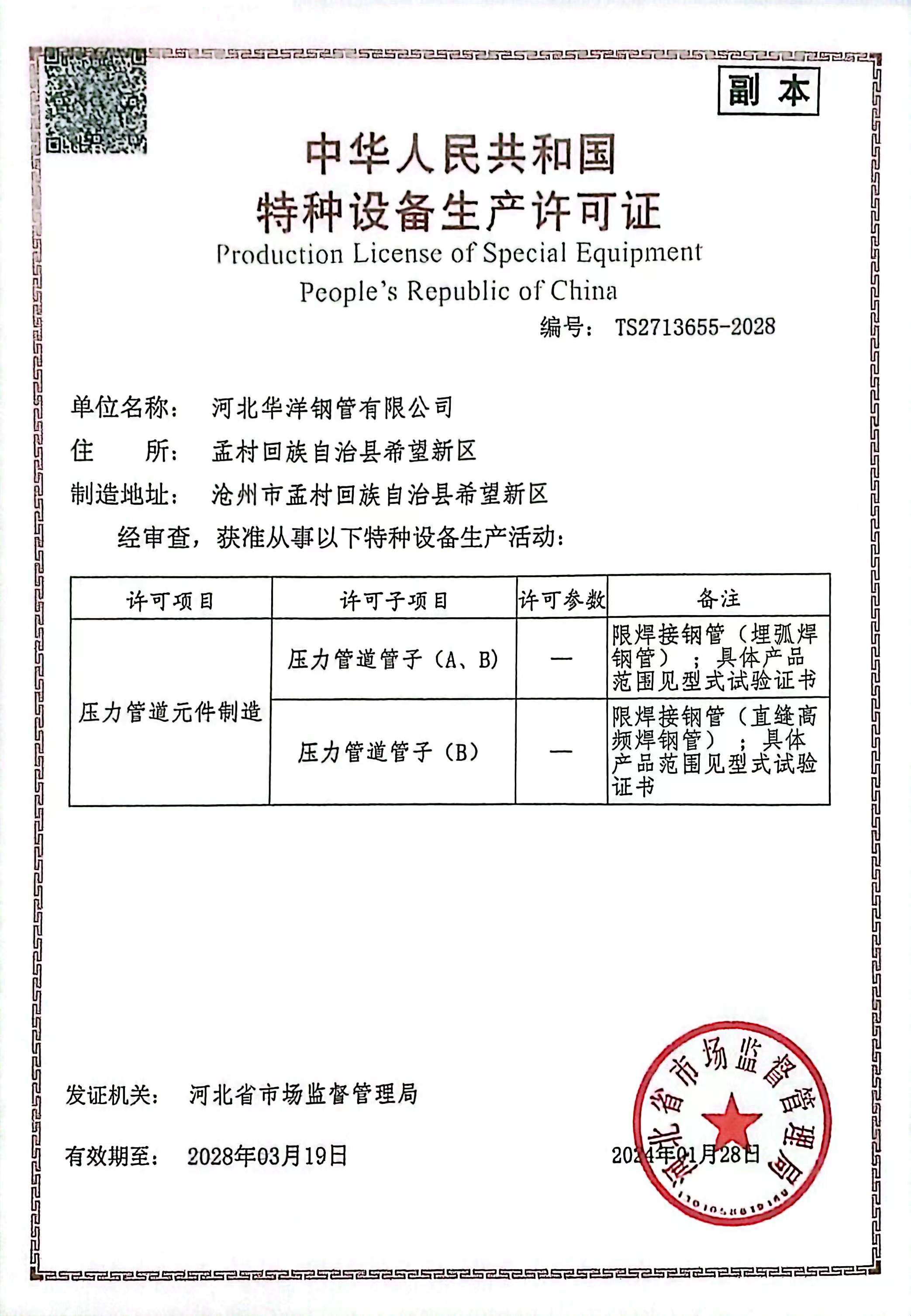 公司現(xiàn)有17條新型的自動化鋼管生產(chǎn)線,包括Φ73-660.4高頻直縫焊鋼管生產(chǎn)線14條、Φ406.4-Φ1422.4直縫雙面埋弧焊鋼管生產(chǎn)線3條,并配備有一條防腐生產(chǎn)線,可進(jìn)行3PE、2PE、FBE、2PP、3PP防腐處理,同時還可提供鋼管深加工服務(wù)。公司擁有先進(jìn)的理化實驗室,可承擔(dān)鋼管的各項物理及化學(xué)檢測與試驗。公司先后取得了ISO9001質(zhì)量管理體系認(rèn)證、ISO14001環(huán)境管理體系認(rèn)證、ISO45001職業(yè)健康安全管理體系認(rèn)證、特種設(shè)備制造許可證、API5L和API2B認(rèn)證證書、歐盟CE認(rèn)證、俄羅斯GOST認(rèn)證、中海油入網(wǎng)證、安全生產(chǎn)標(biāo)準(zhǔn)化二級企業(yè)等標(biāo)準(zhǔn)質(zhì)量體系認(rèn)證。